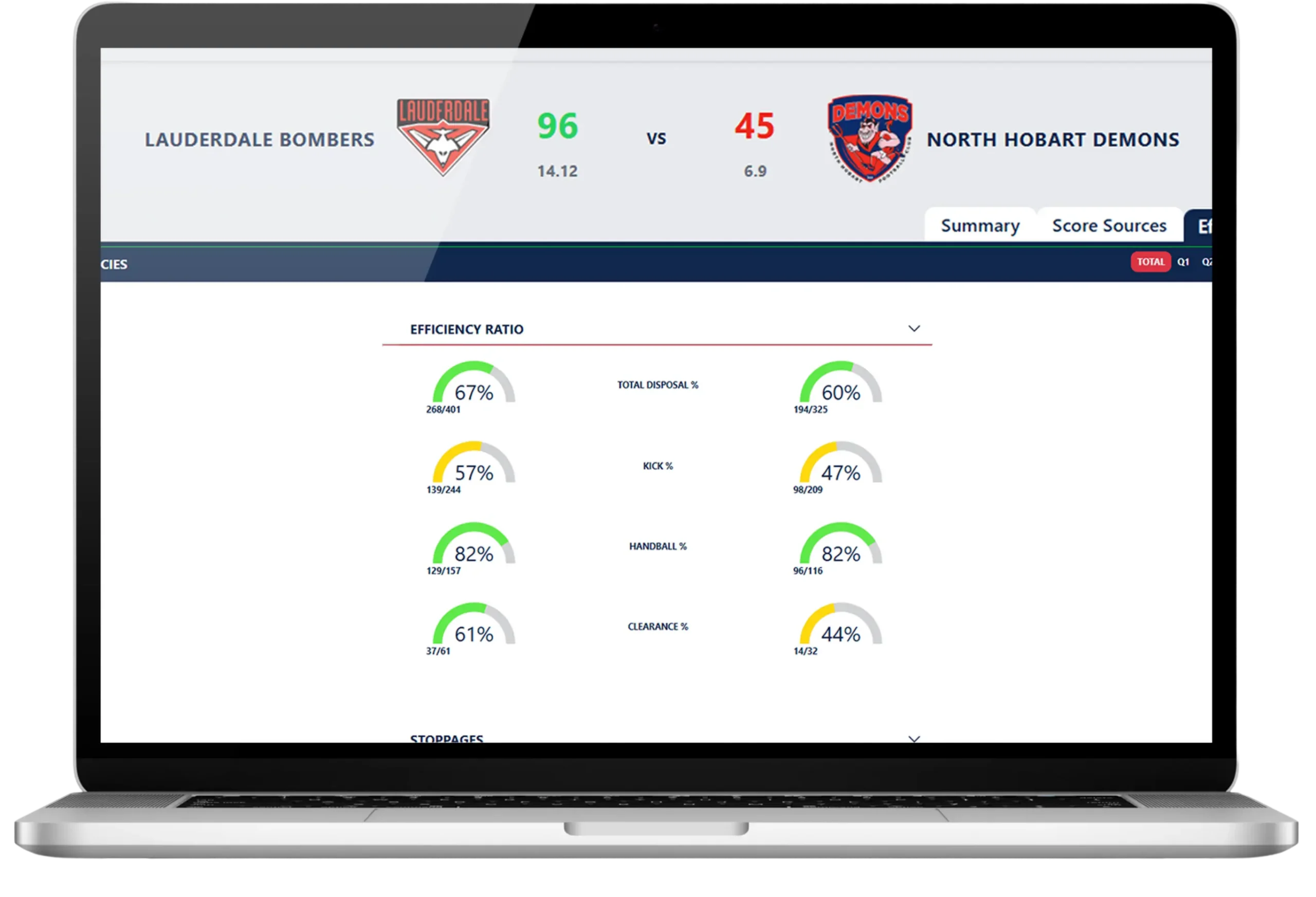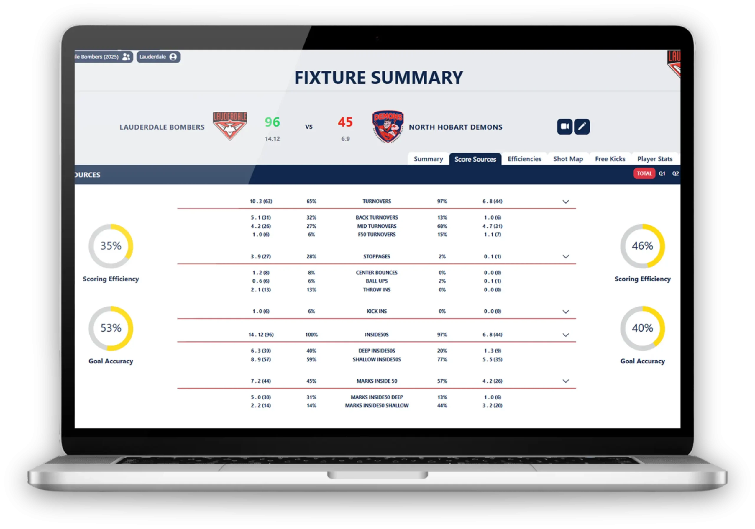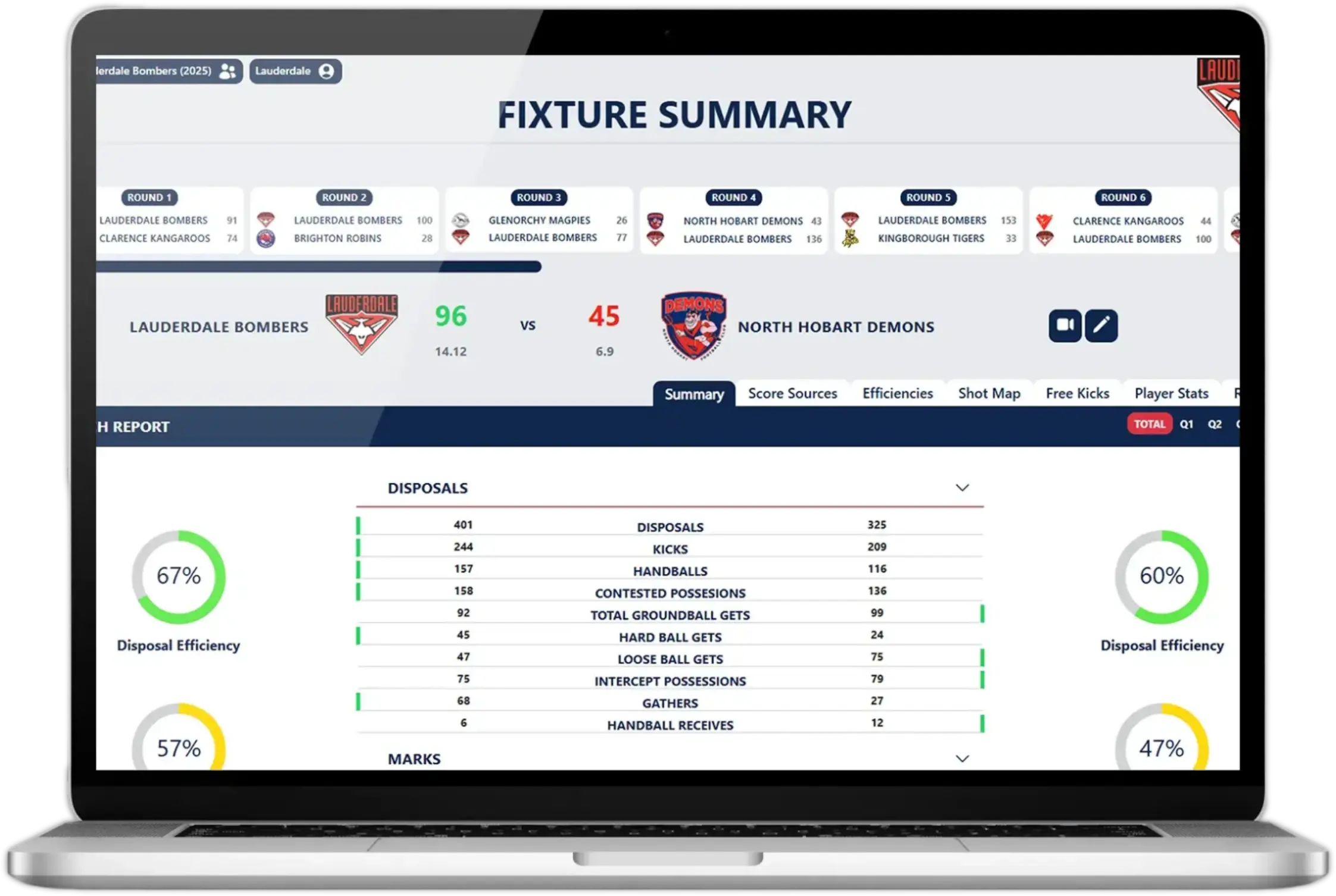 Evaluate team and player effectiveness with detailed efficiency metrics. Track disposal efficiency, inside 50 conversions, scoring accuracy, and more to identify strengths and areas for improvement.