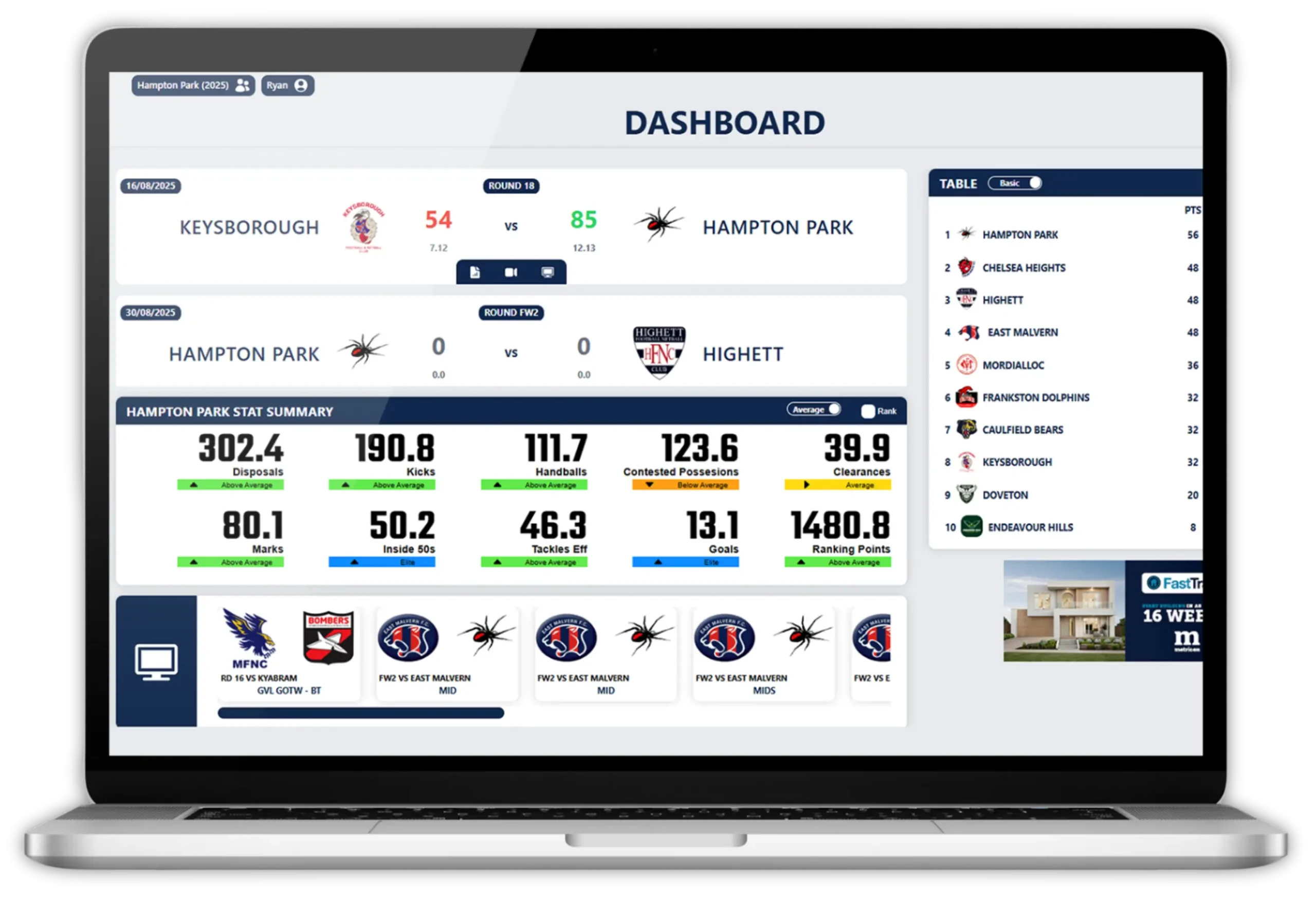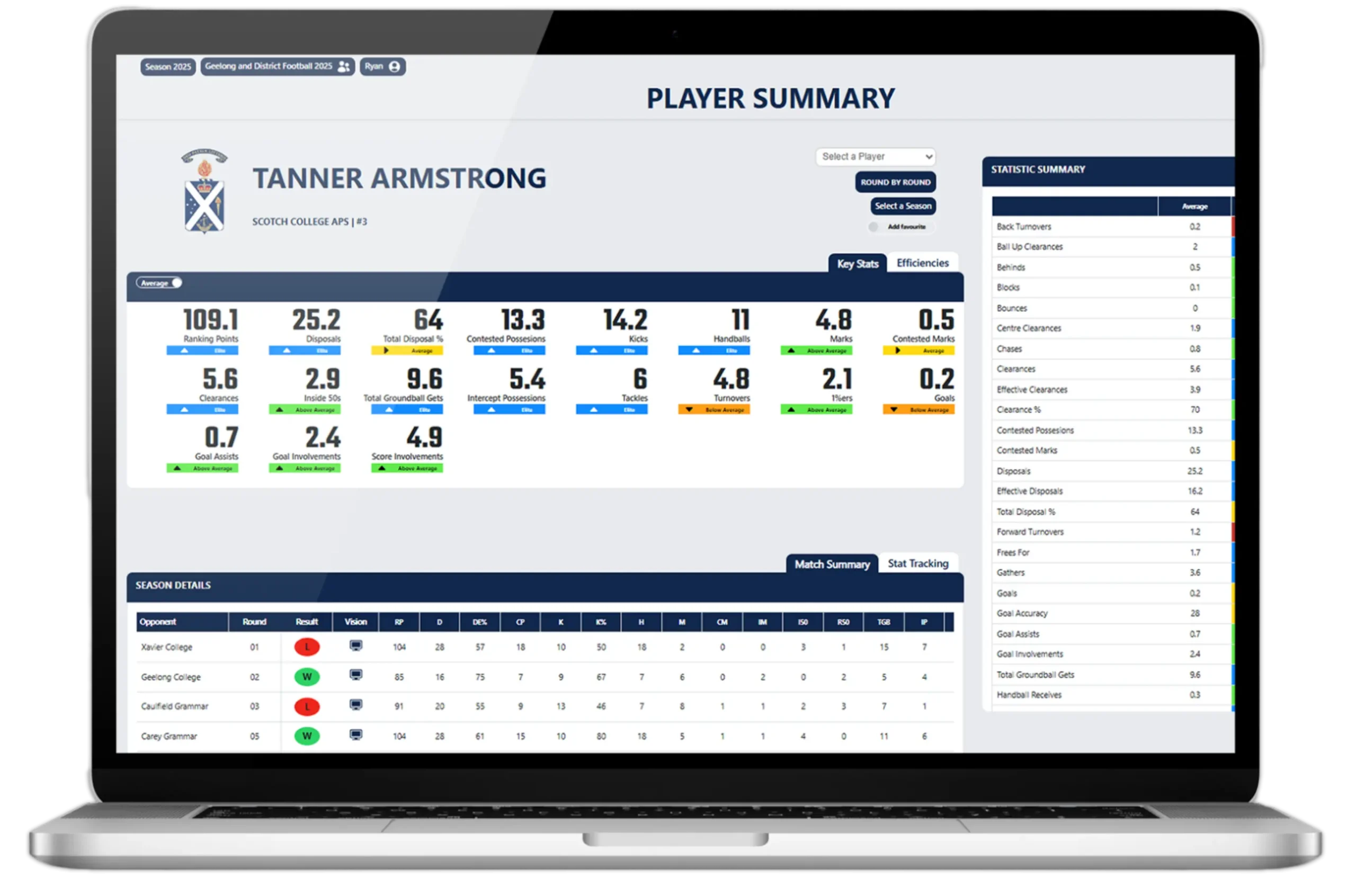 Access detailed stats for every player, including disposals, tackles, marks, clearances, contested possessions, and other key performance indicators—perfect for coaching feedback, reviews, and recruiting.